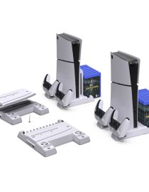 The DOBE TP5-3532B Cooling Base is a multifunctional stand built to support PlayStation 5 and PS5 Slim consoles. It improves airflow using dual cooling fans, while also serving as a charging dock for two controllers. A built-in headset holder and RGB lighting enhance the look and function of your gaming area.